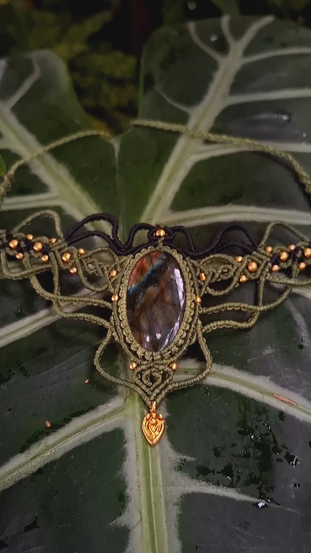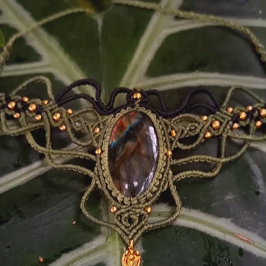 A handmade macramé necklace featuring a stunning labradorite that reflects shades of gold, bronze, violet and blue.