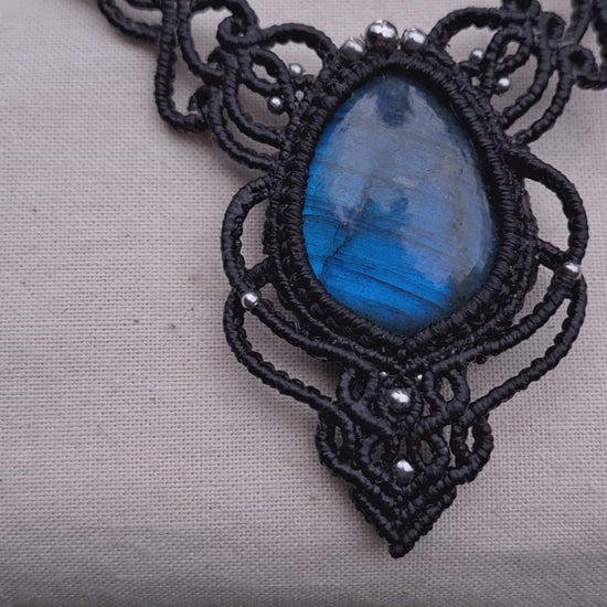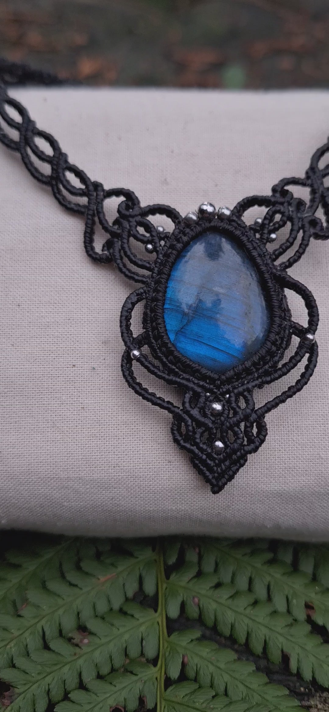This unique handcrafted macramé necklace combines intricate design with the natural magic of labradorite.