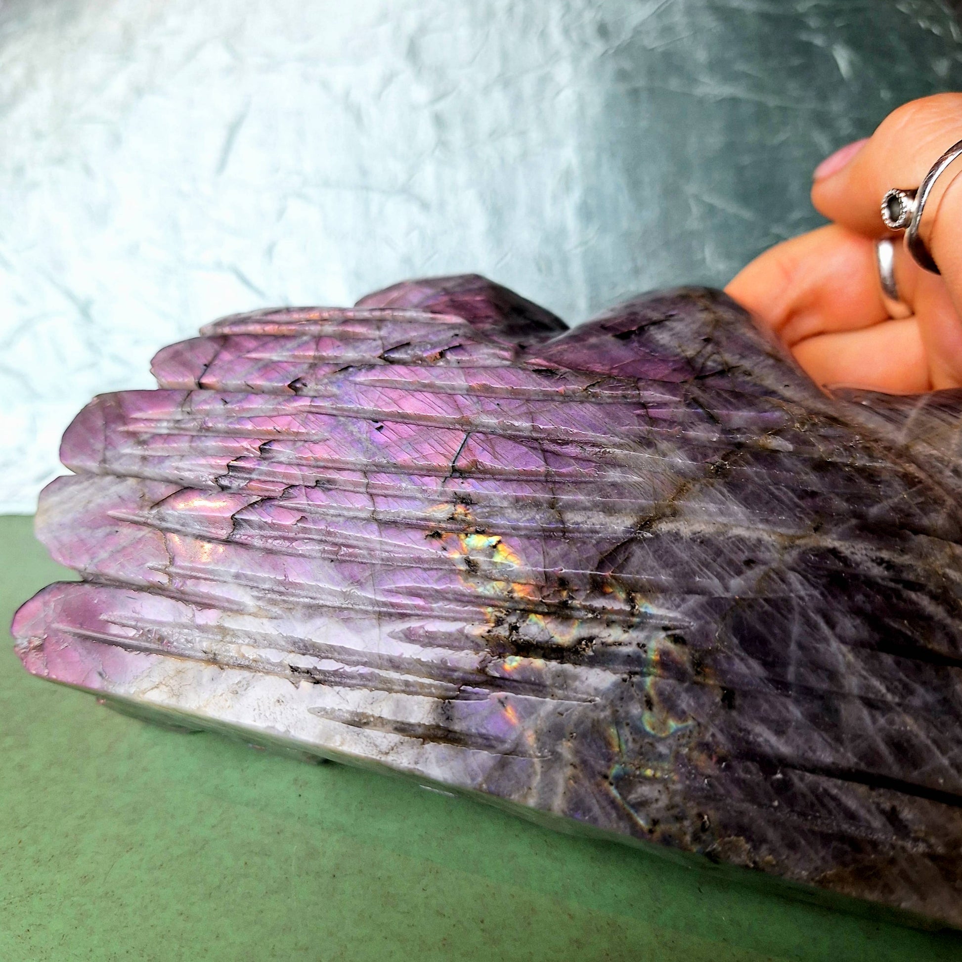 Das Besondere: Er hat ein sehr seltenes Farbspiel in Lila, Pink und Orange. Ein absoluter Hingucker für Edelstein-Sammler oder als spirituelle Deko.