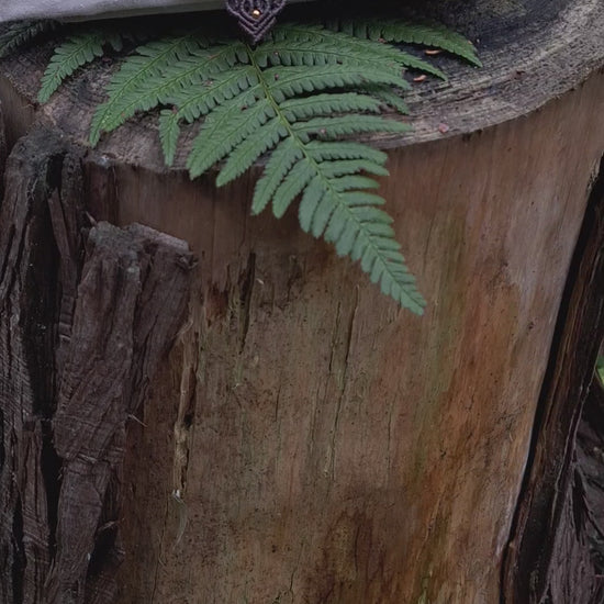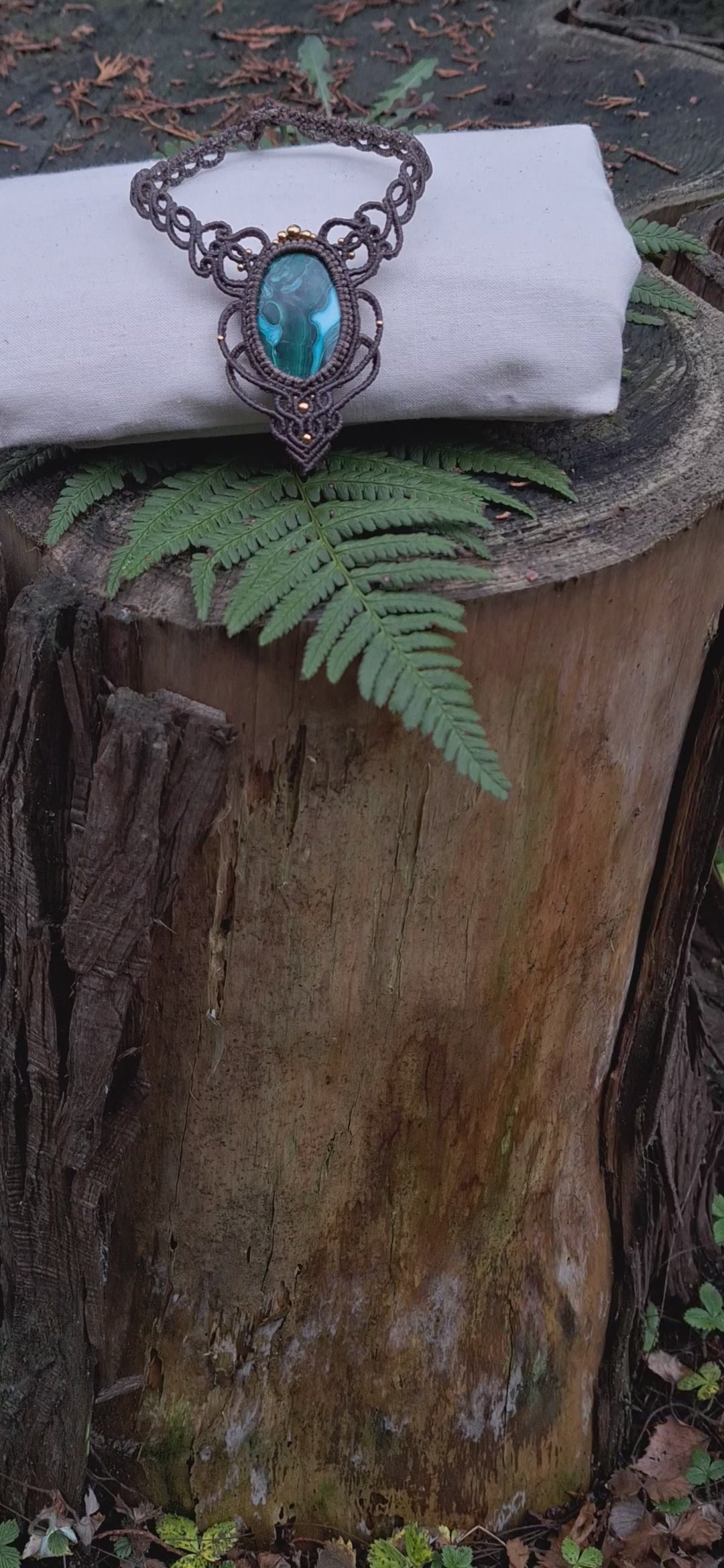 The handcrafted “Forest Whispers” macramé necklace carries the deep energy of the forest.