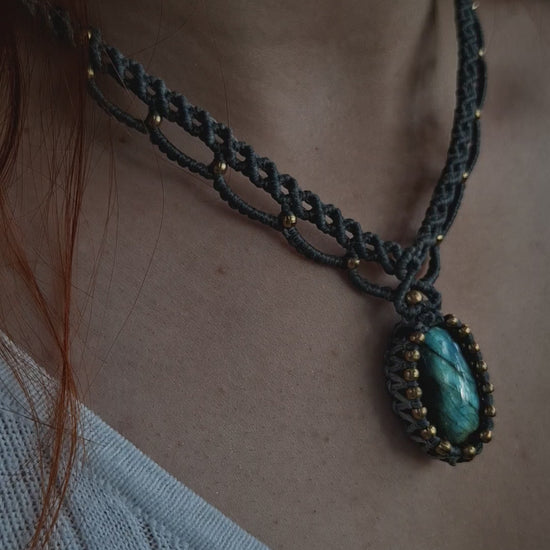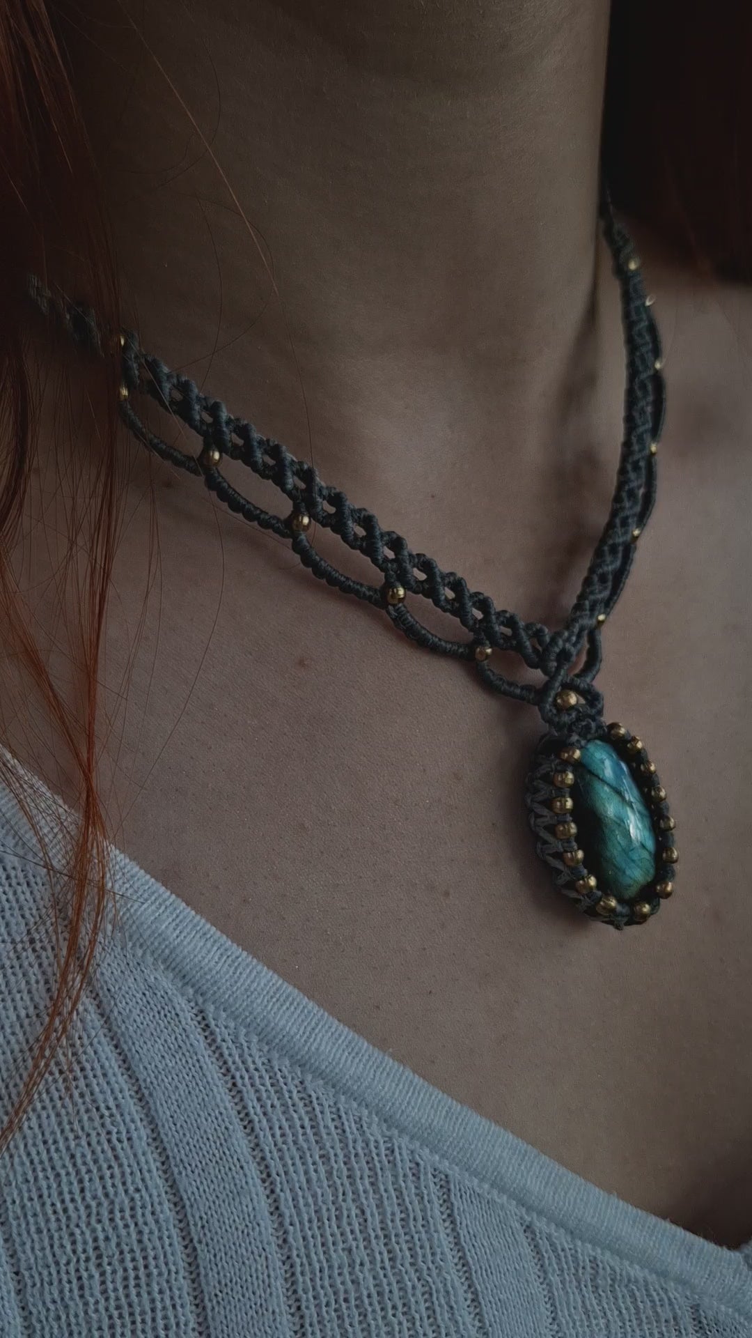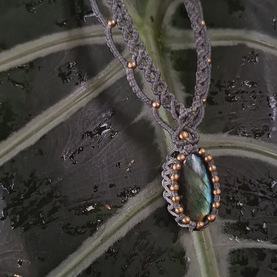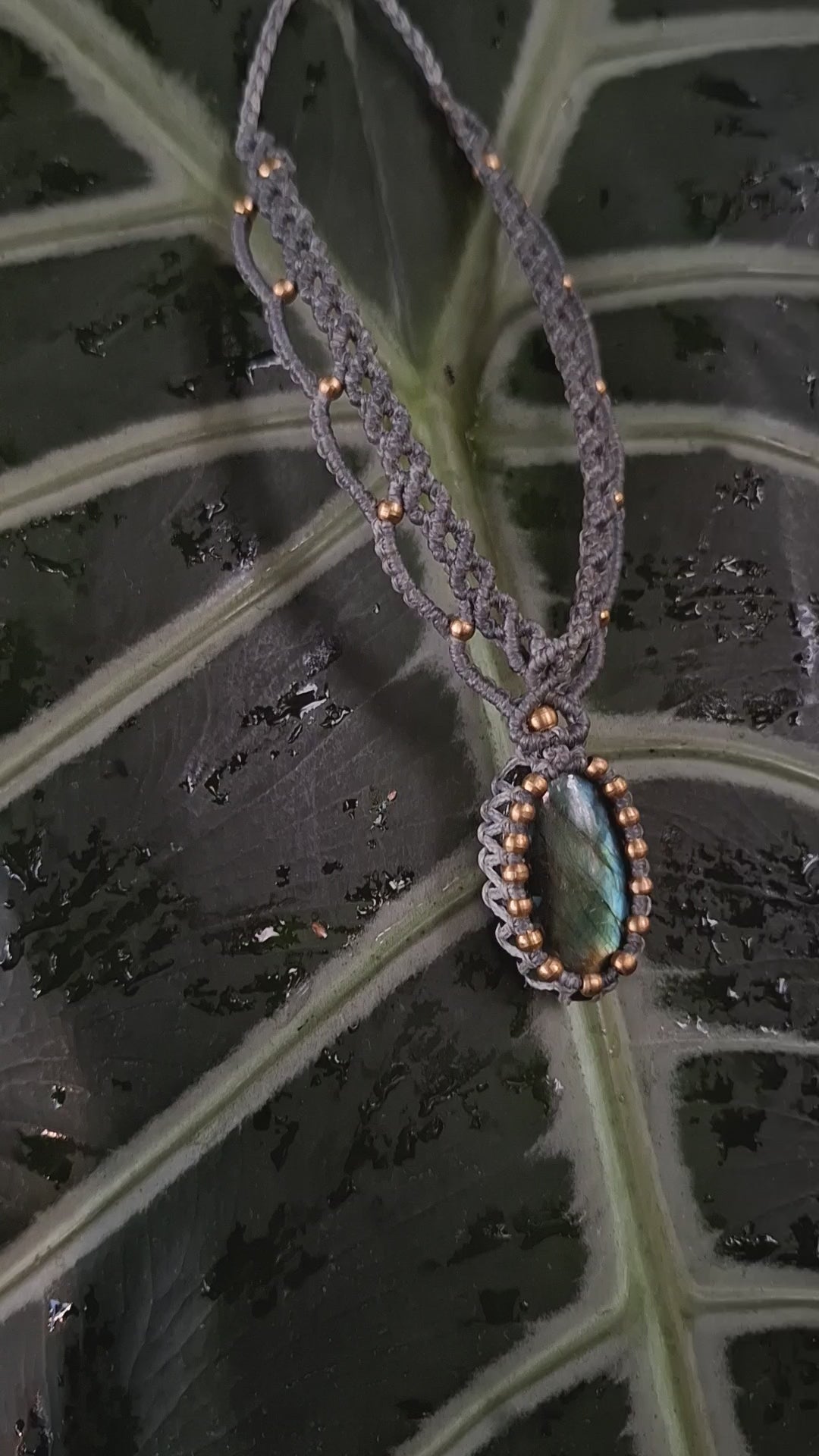 Diese wunderschöne Makramee Kette mit Labradorit ist ein handgefertigtes Schmuckstück voller Energie und Ausdruckskraft.